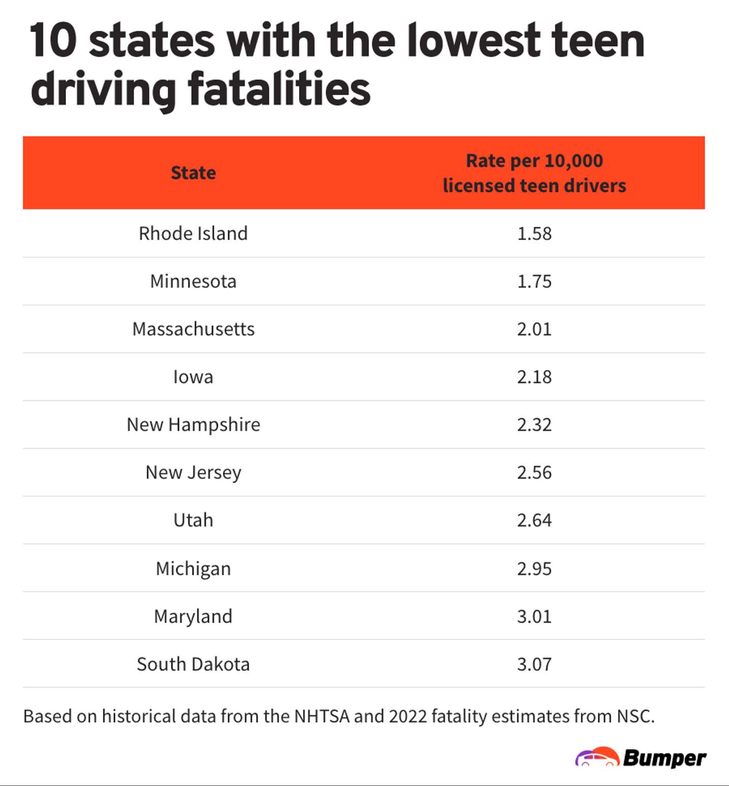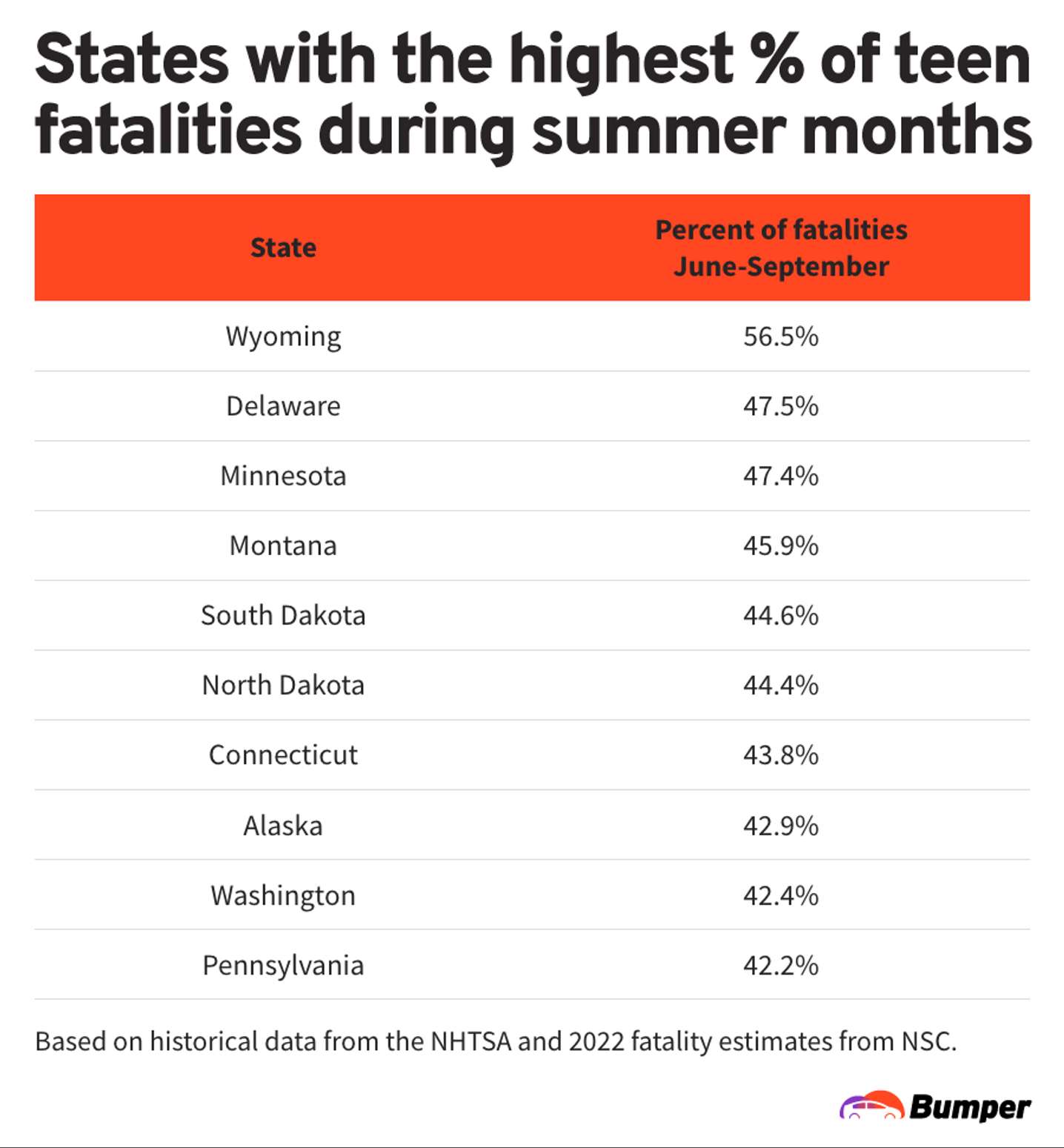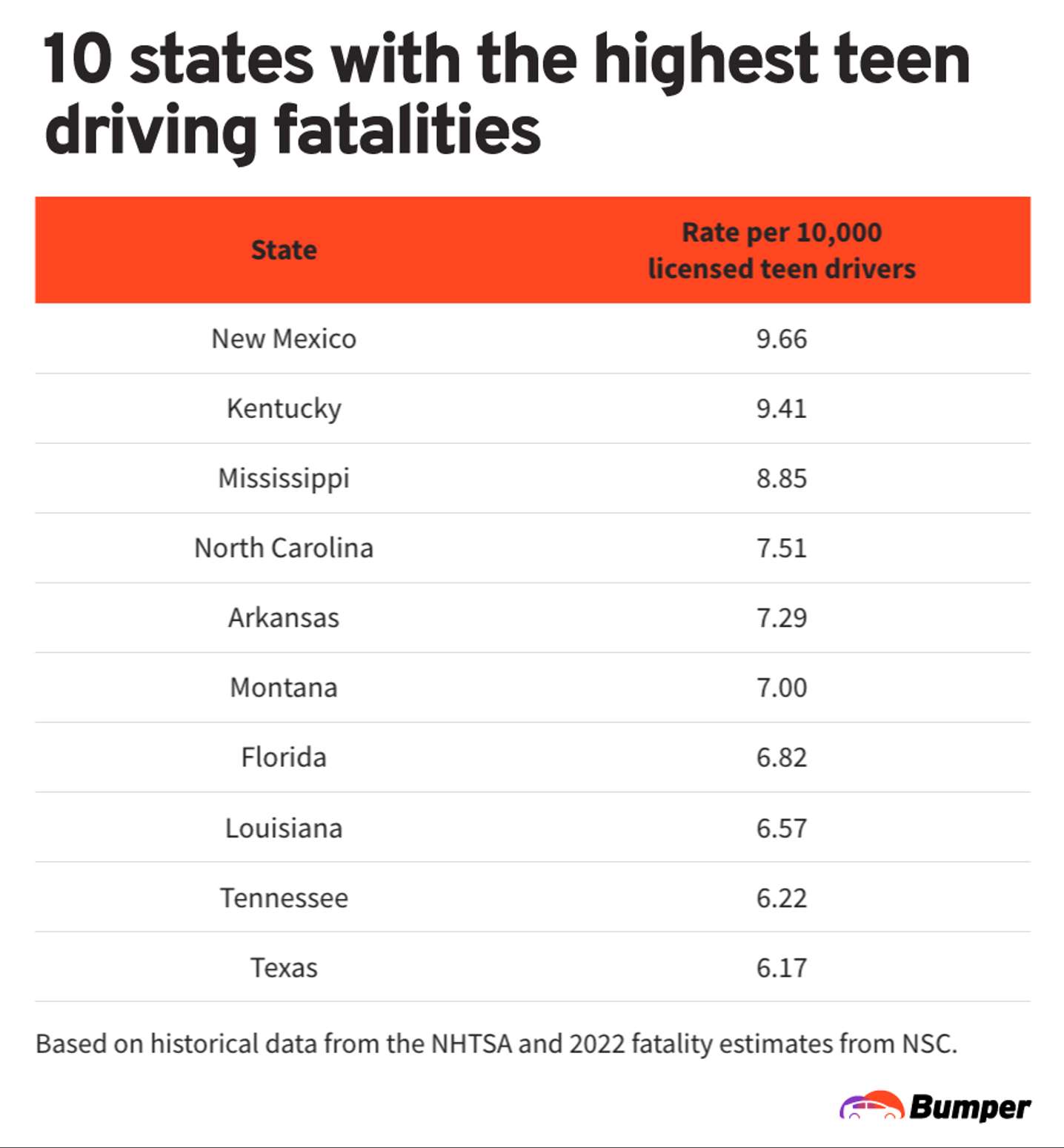Bumper used historical accident data from the National Highways Traffic Safety Administration (NHTSA) and Federal Highway Administration and 2022 fatality estimates from the National Safety Council (NSC) to determine its findings on teen roadway deaths.