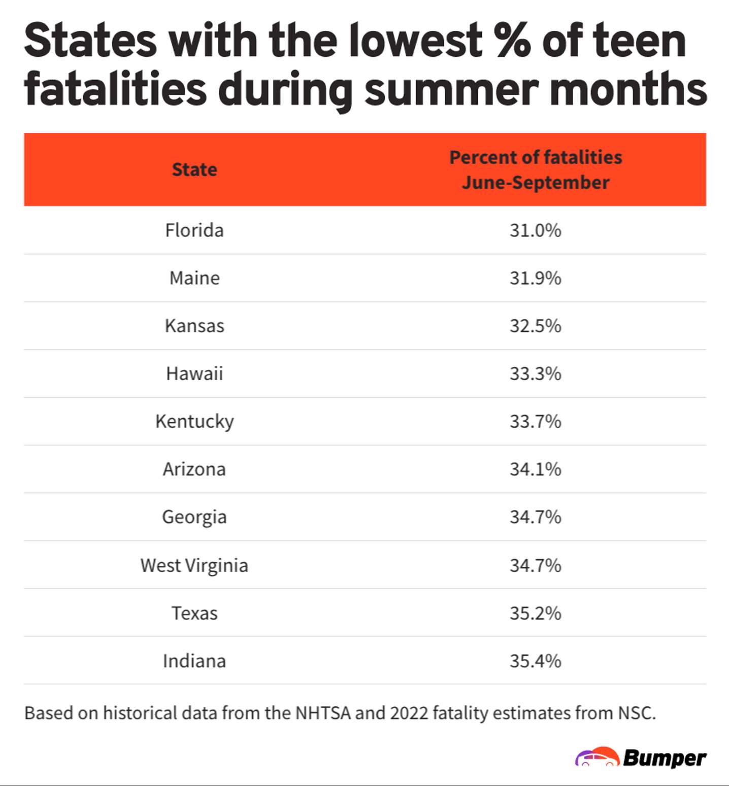 - Florida, Maine and Kansas have the lowest percentage of teen fatalities during the summer months. We estimate Florida had the lowest percentage of 2022 teen driving fatalities during summer months (31.0%) followed by Maine (31.9%), Kansas (32.5%), Hawaii (33.3%) and Kentucky (33.7%).